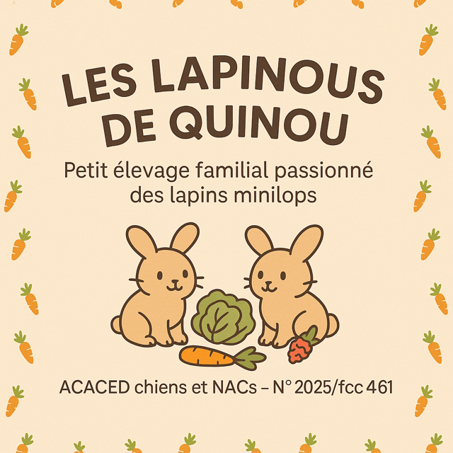 Les Lapinous de Quinou est un élevage familial de lapins Minilops situé dans le Gard. Nous sommes passionnés par ces adorables boules de poils et nous nous efforçons de leur offrir les meilleurs soins et une vie heureuse au sein de notre élevage. Venez découvrir nos lapins et partager notre amour pour ces petits animaux !